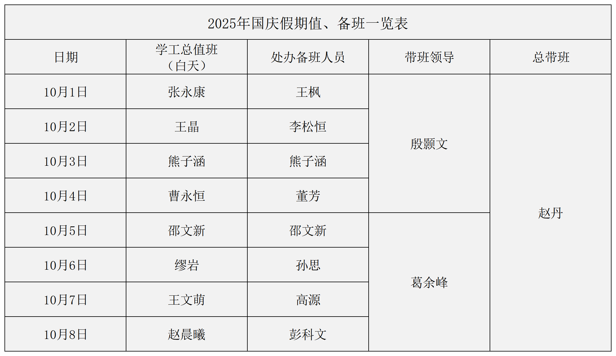 2025年国庆假期学生工作处值、备班一览表